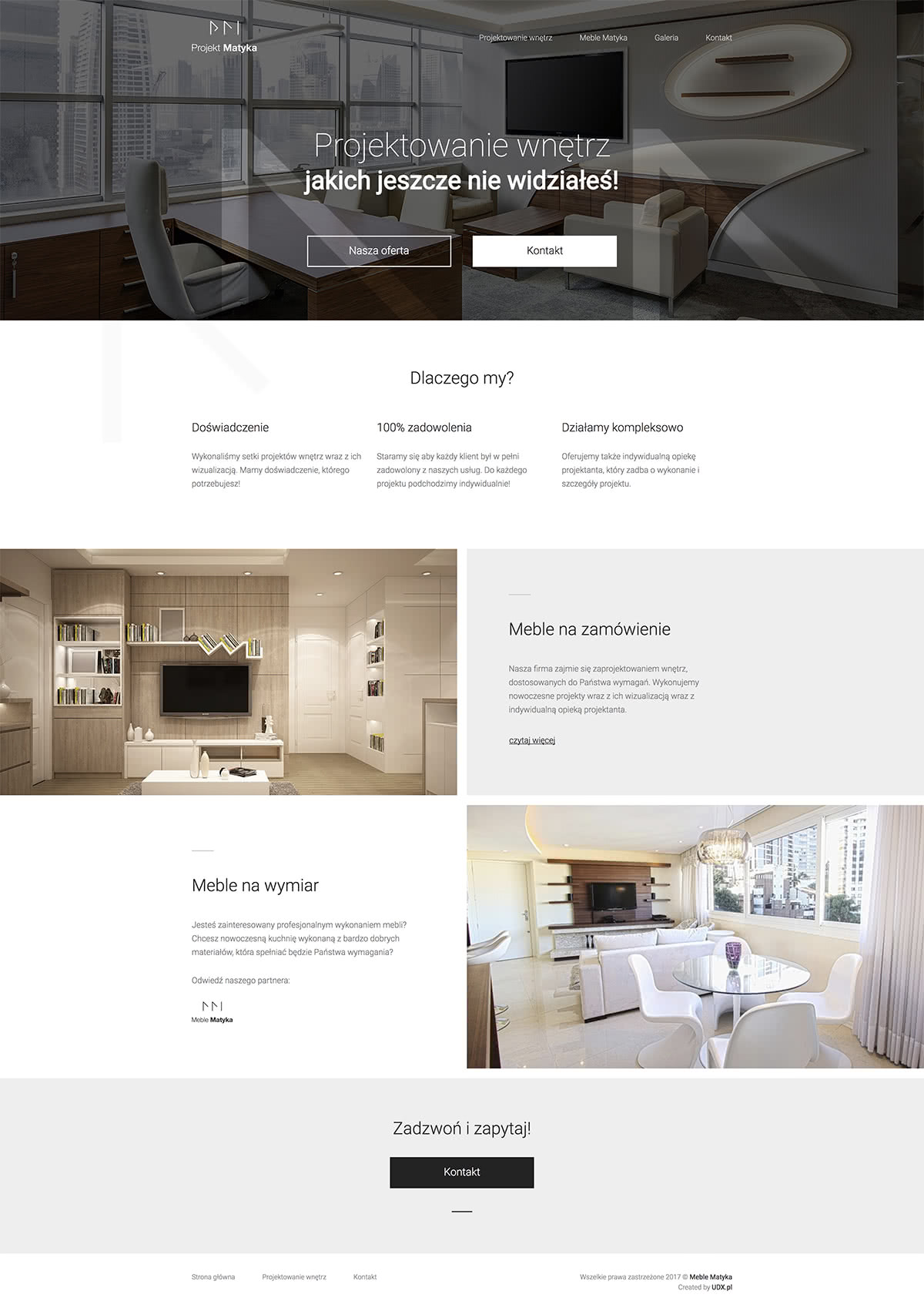 Wykonaliśmy projekt wraz z identyfikacją graficzną dla firmy Matyka. Zamysłem było stworzenie jednolitej identyfikacji dla “Projekt Matyka” i “Meble Matyka”, dwóch niezależnych filarów firmy, w której każdy związany jest z określoną dziedziną.